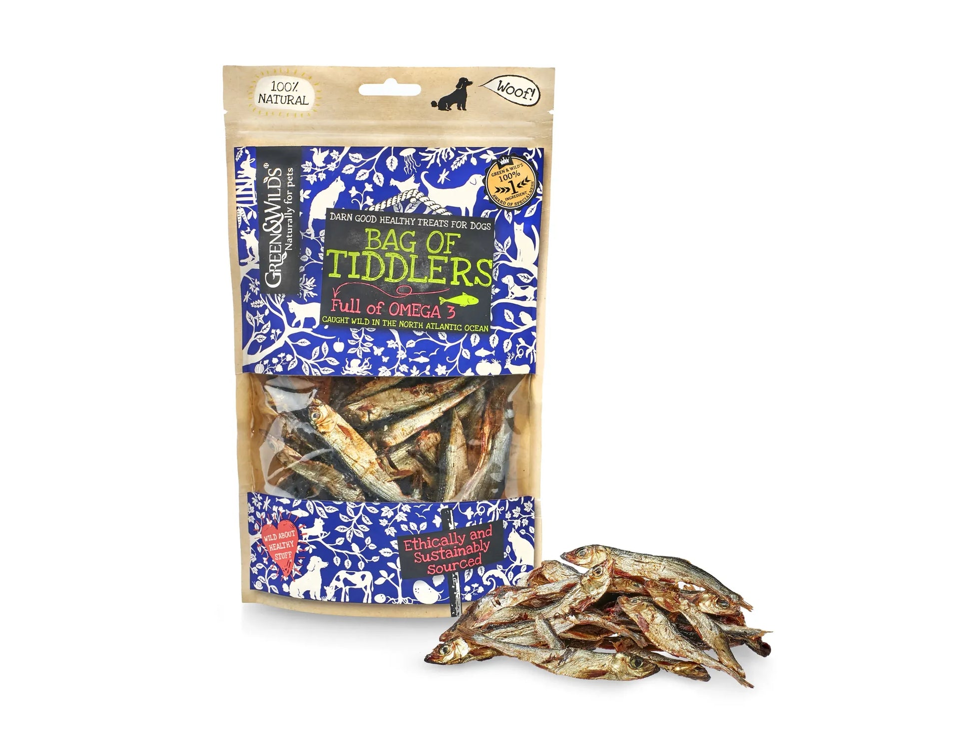 100% Natural small fish. Green and Wild's little tiddlers are air dried to hold in all that fishy goodness.